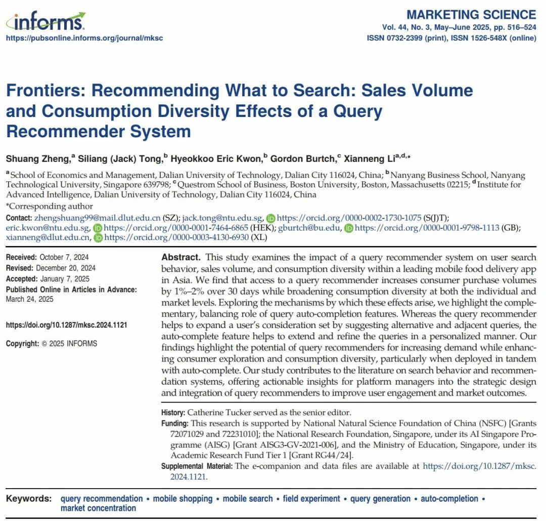 In May 2025, the paper Recommending What to Search: Sales Volume and Consumption Diversity Effects of a Query Recommender System was published in Marketing S...