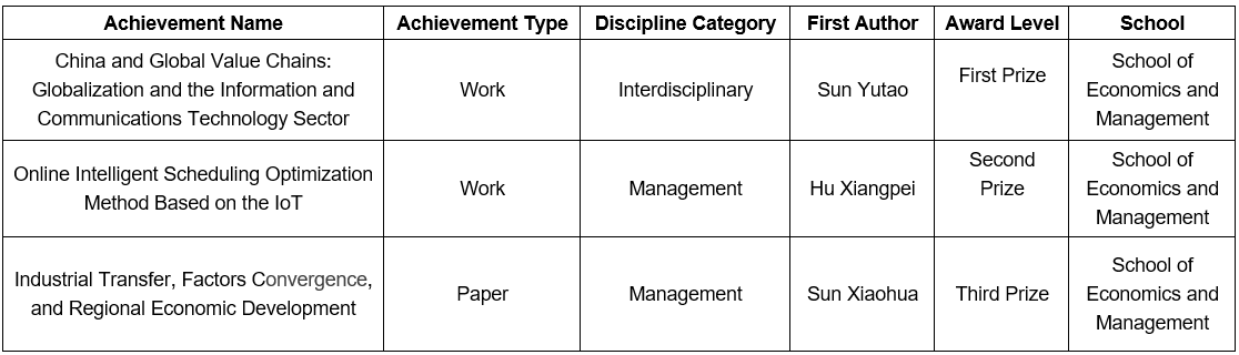 The Ministry of Education of the People's Republic of China has recently announced the list of award-winning achievements in the Ninth Award for Outstanding Scientific Research Achievements for Higher Education Institutions (Humanities and Social Sciences). Dalian University of Technology was awarded three research accomplishments in the field of humanities and social sciences. Among them, Professor Sun Yutao from School of Economics and Management was awarded the first prize for his work, "China and Global Value Chains: Globalization and the Information and Communications Technology Sector", marking the university's inaugural occasion of receiving the highest-level and most influential award in the field of humanities and social sciences in China.