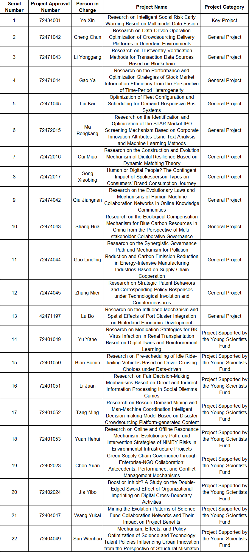 Recently, the National Natural Science Foundation of China announced the evaluation results of the centrally received application projects. The School of Economics and Management at Dalian University of Technology achieved a breakthrough for the first time with over 20 approved projects, totaling 22, including 1 Key Program, 12 General Programs, and 9 Youth Programs. The approval rate for new projects surpassed the 40% threshold for the first time, reaching 44.90%, which is nearly four times the national average funding rate. Both figures have set new historical highs for the School.