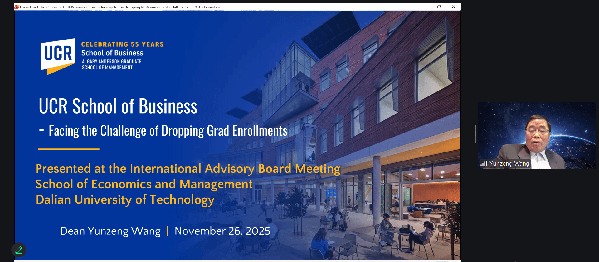 On November 26, 2025, the Annual Meeting of the International Advisory Board (IAB) , School of Economics and Management, Dalian University of Technology was successfully held online. The meeting brought together over 40 participants, including IAB members, the School's leadership, faculty, and staff. IAB members in attendance were: Joseph A. Alutto, Distinguished Professor, Emeritus, Fisher College of Business, Ohio State University, Former American provost of the National Center for Industrial Science and Technology Management Development at Dalian, Wai Fong Boh, Vice President of Nanyang Technological University, Edwin Tai Chiu Cheng, Dean, Business School, The Hong Kong Polytechnic University, Franz Decker, CIO and Senior Vice President BMW Group IT, Ananth V. Iyer, Dean, School of Management, University at Buffalo, Clas Neumann, Senior Vice President, Head of SAP Labs Network, Saonee Sarker, Richard E. Sorensen Dean, Pamplin College of Business, Virginia Tech, Yong Shi, Counselor (Scientific Advisor in Big Data) of the State Council of the People's Republic of China, Chair Professor of University of Chinese Academy of Sciences, Lixin Tang, Academician of Chinese Academy of Engineering, Vice President, Northeastern University, Ulrich Thonemann, Dean, Faculty of Management, Economics and Social Sciences, University of Cologne, Yunzeng Wang, Dean, School of Business, University of California, Riverside, Shanlin Yang, Academician of Chinese Academy of Engineering, Professor of Hefei University of Technology. The meeting was chaired by Xu Zhaoguang, SEM Assistant Dean.