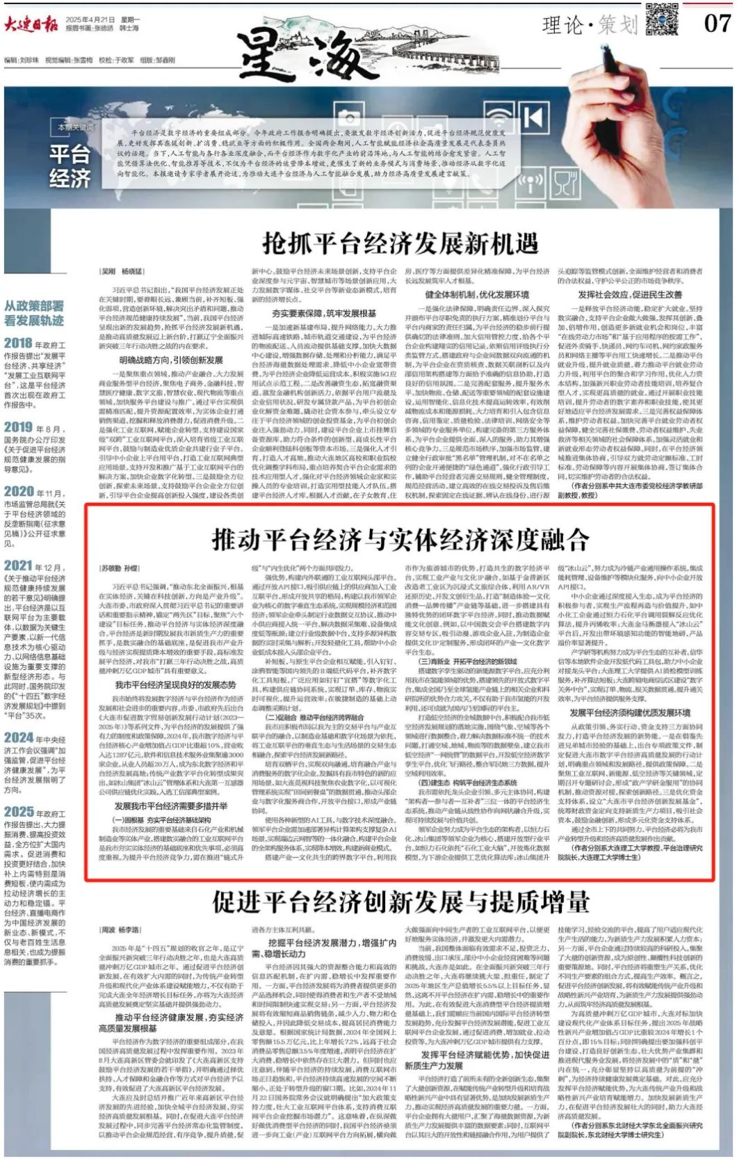 4月21日,经济管理学院教授、平台治理研究院院长苏敬勤与博士生孙缇在《大连日报》发表题为《推动平台经济与实体经济深度融合》的文章。文章指出,大连始终将发展数字经济与平台经济作为经济发展和社会进步的重要内容。市委、市政府先后出台《大连市促进数字贸易创新发展行动计划(2023-2025年)》等系列文件,为平台经济的发展提供了强有力的制度和政策保障。当前大连平台经济发展势头良好。为进一步推动平台经济发展,应着力从四方面发力:一是围绕实体产业,夯实平台经济基础架构,推动产业“链式升级”与“内生优化”;二是推进平台经济跨界融合,搭建产业文化共生的跨界数字平台;三是开拓平台经济新赛道,开发低空经济数字孪生平台;四是构筑平台经济生态系统,推动产业链从线性协作向网状融合升级。文章建议从政策引领、务实行动、资金支持三方面协同发力,打造平台经济发展的新势能,助力大连产业转型升级和经济高质量发展。现转发全文。