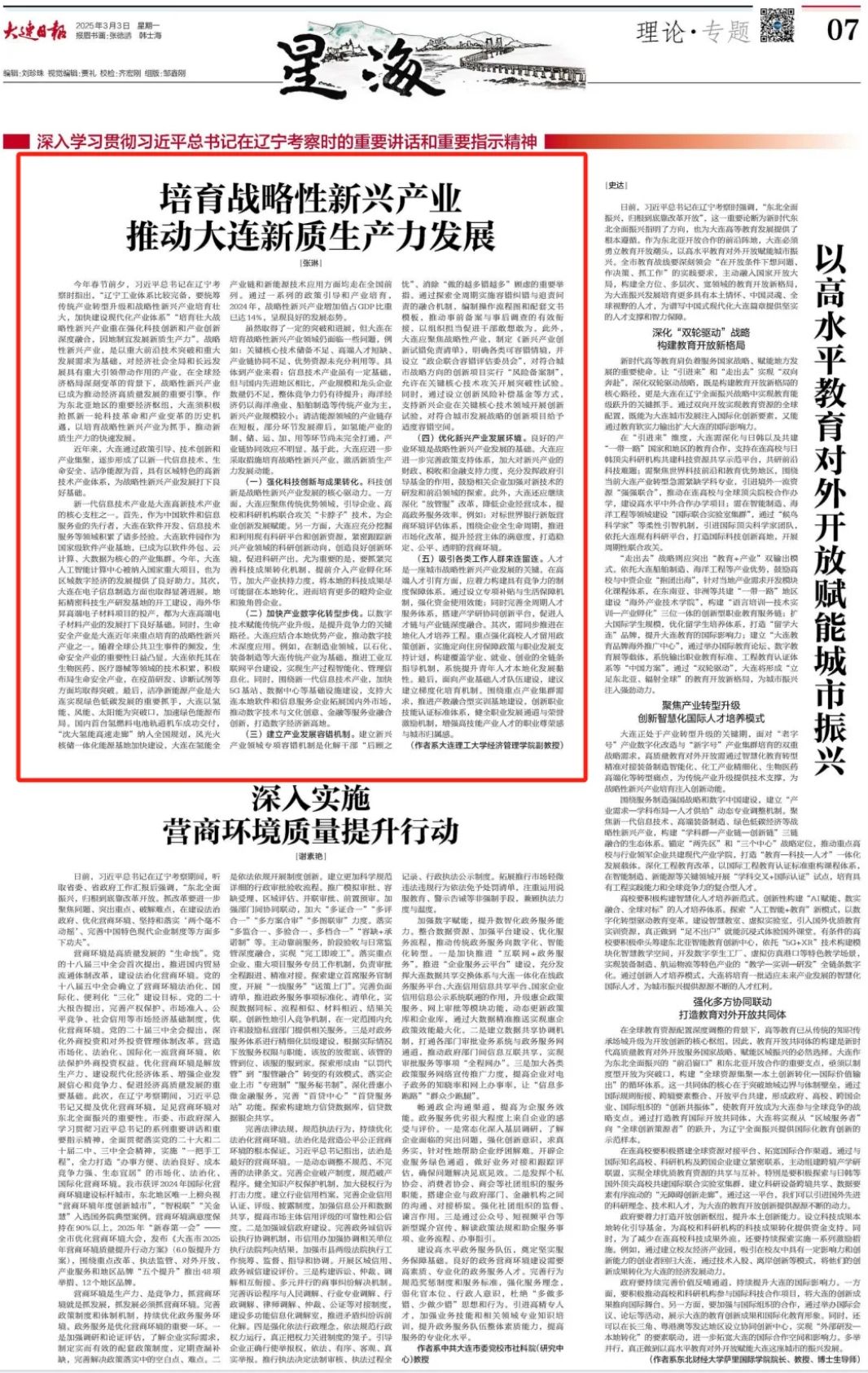 习近平总书记在辽宁考察时指出:“辽宁工业体系比较完备,要统筹传统产业转型升级和战略性新兴产业培育壮大,加快建设现代化产业体系。传统产业要强化产业基础再造和重大技术装备攻关,不断提升核心竞争力。培育壮大战略性新兴产业重在强化科技创新和产业创新深度融合,因地制宜发展新质生产力。” 战略性新兴产业,是以重大前沿技术突破和重大发展需求为基础,对经济社会全局和长远发展具有重大引领带动作用的产业。在全球经济格局深刻变革的背景下,战略性新兴产业已成为推动经济高质量发展的重要引擎。作为东北亚地区的重要经济枢纽,大连需积极抢抓新一轮科技革命和产业变革的历史机遇,以培育战略性新兴产业为抓手,推动新质生产力的快速发展。