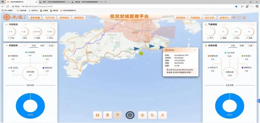 合作研发的低空服务管理平台可独立部署并与运控系统对接,实现指令接收与飞行动态反馈。系统支持生成和执行飞行计划,允许用户灵活设置飞行速度、飞行高度等参数,并实时模拟飞行动态。仿真器能够同时控制多架航空器飞行,模拟复杂飞行场景下的突发情况,验证运控系统的处理能力。软件适用于飞行任务规划测试、空域调度模拟及航空器运行验证,满足空中交通管理与低空运行需求。成果在天津、南宁、内蒙等地得到应用。