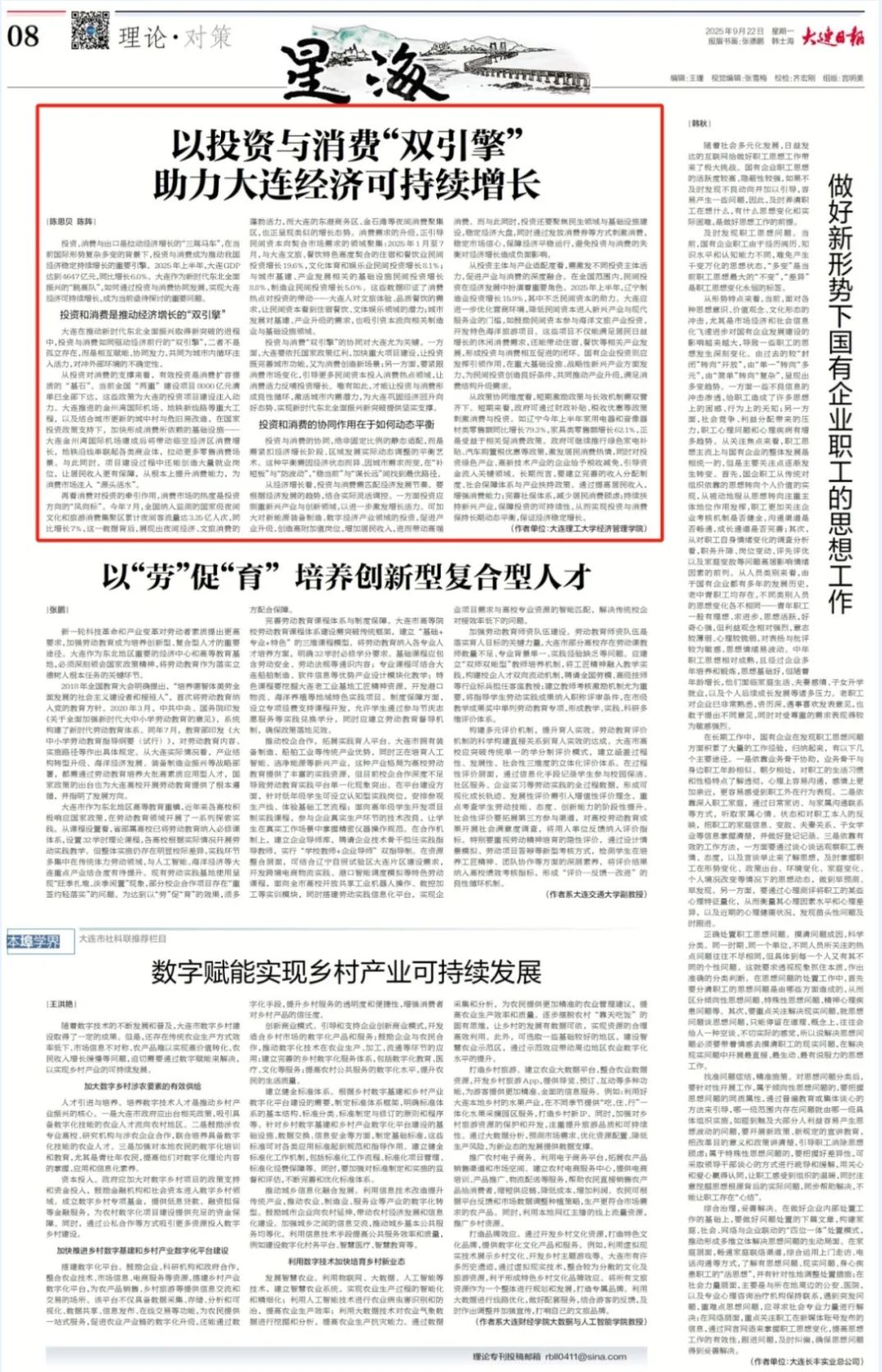 经管睿评 |陈思贝、陈阵:以投资与消费“双引擎”助力大连经济可持续增长 2025年09月23日 【编者按】9月22日,经济管理学院2023级国际经济与贸易专业本科生陈思贝和陈阵副教授在《大连日报》发表题为《以投资与消费“双引擎”助力大连经济... |